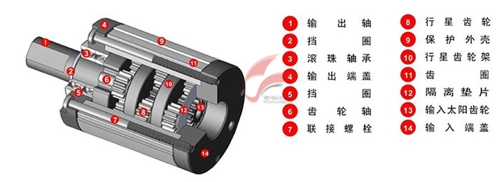 行星減速機(jī)原理:驅(qū)動(dòng)源(馬達(dá))以直接連接的方式啟動(dòng)太陽齒輪,太陽齒輪將組合于行星齒輪架上的行星齒輪帶動(dòng)運(yùn)轉(zhuǎn)。整組行星齒輪系統(tǒng)沿著外齒輪環(huán)自動(dòng)運(yùn)行轉(zhuǎn)動(dòng),行星架連接出力軸輸出達(dá)到加速目的。更高減速比則需要由多組階段齒輪與行星齒輪倍增累計(jì)而成。
