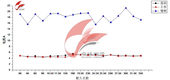 3、電流值取樣規(guī)則如下:每上升下降1000——2000次為一個循環(huán),進行取樣,每次 測量10組開閉循環(huán)的電流值,包括上升下降的啟動電流、堵轉(zhuǎn)電流。如此反復(fù)一直持續(xù)到出現(xiàn)故障停止工作或達到預(yù)期的耐久壽命為止。