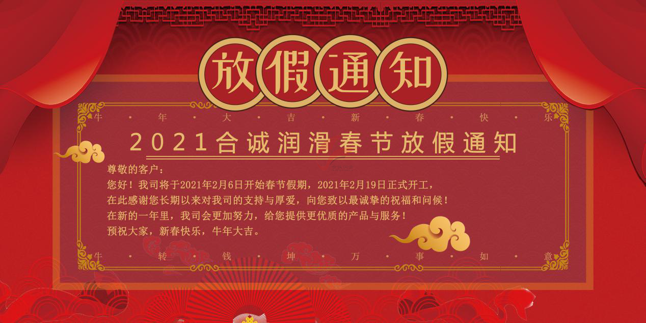 合誠(chéng)潤(rùn)滑定于2021年2月6日(農(nóng)歷十二月二十五)至2月18日(農(nóng)歷正月初七)放假共十三天,2月19日(農(nóng)歷正月初八)正式上班。